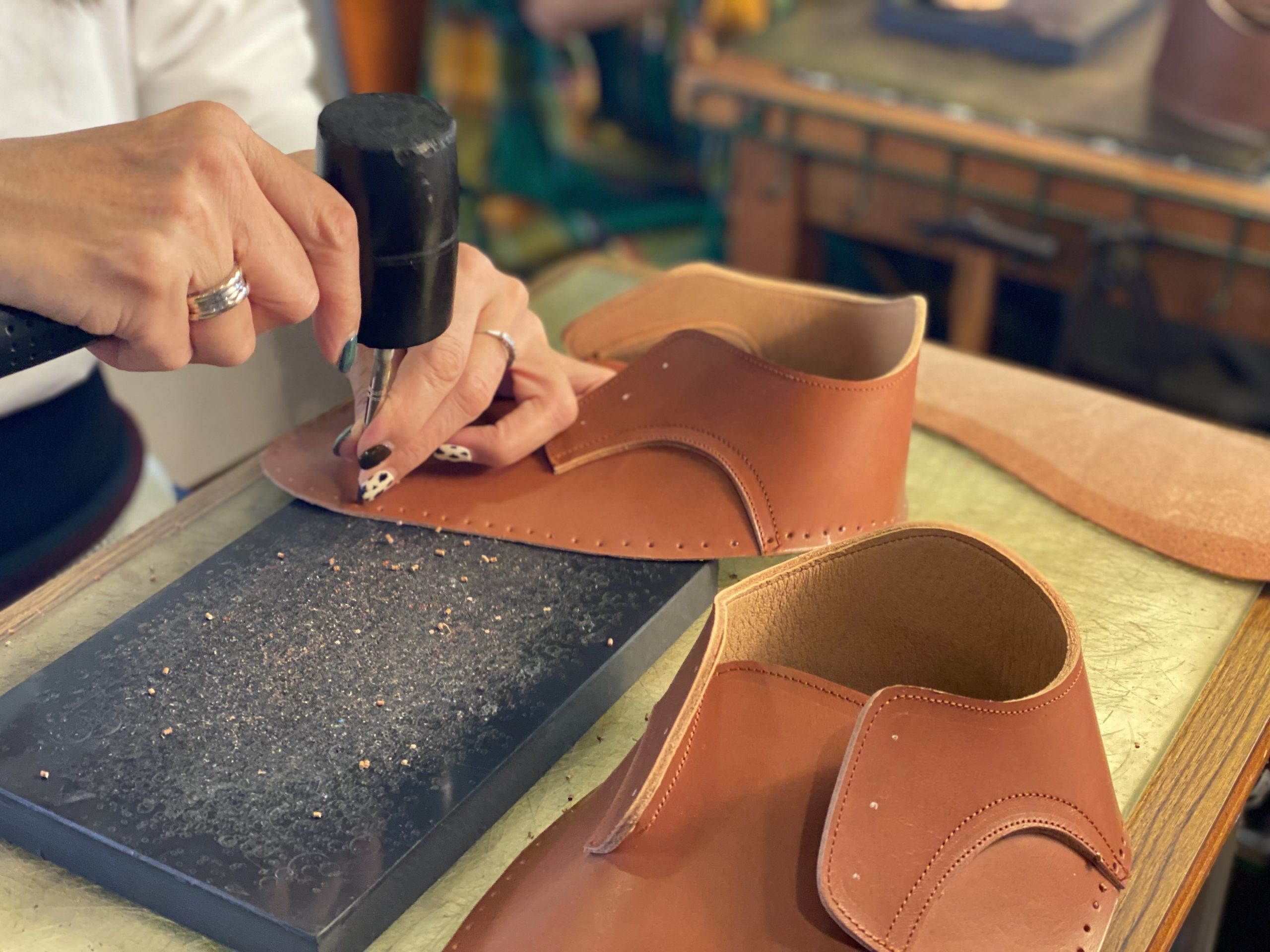 約4〜5時間(1時間休憩あり) 穴あけ作業、手縫い作業、ソールの削り作業、等を行っていただきます。